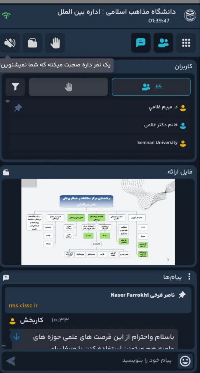 این نشست با سخنرانی دکتر ناصر فرخی، معاون امور علمی مرکز مطالعات و همکاری‌های علمی بین‌المللی وزارت علوم، تحقیقات و فناوری، و با استقبال گسترده معاونان و مدیران بین‌الملل دانشگاه‌های سراسر کشور و همچنین مدیران بین‌الملل دانشگاه‌های بصره و کوفه عراق، و با مدیریت دکتر مریم غلامی، مدیر دفتر همکاری های علمی بین المللی دانشگاه بین المللی مذاهب اسلامی به صورت مجازی برگزار گردید.