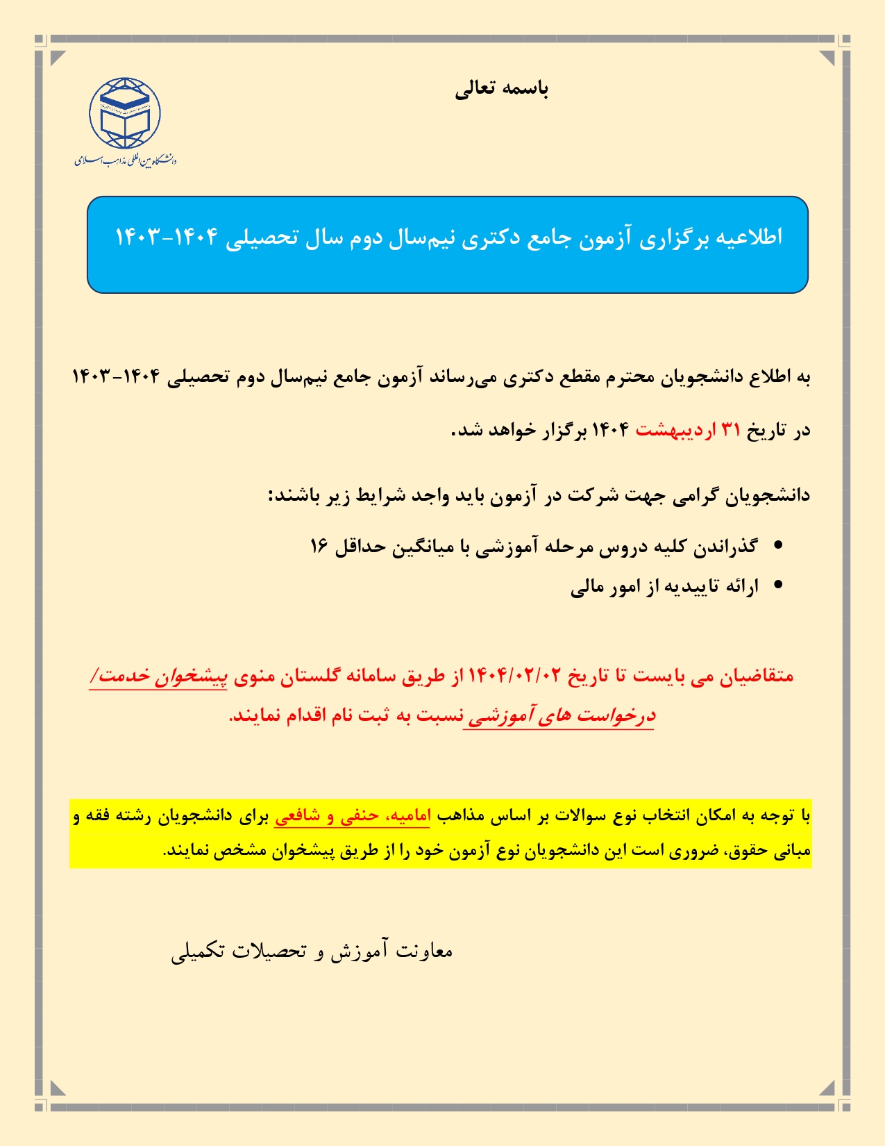 اطلاعیه ثبت نام آزمون جامع دکتری نیمسال دوم ۱۴۰۳-۱۴۰۴ دانشگاه بین‌المللی مذاهب اسلامی