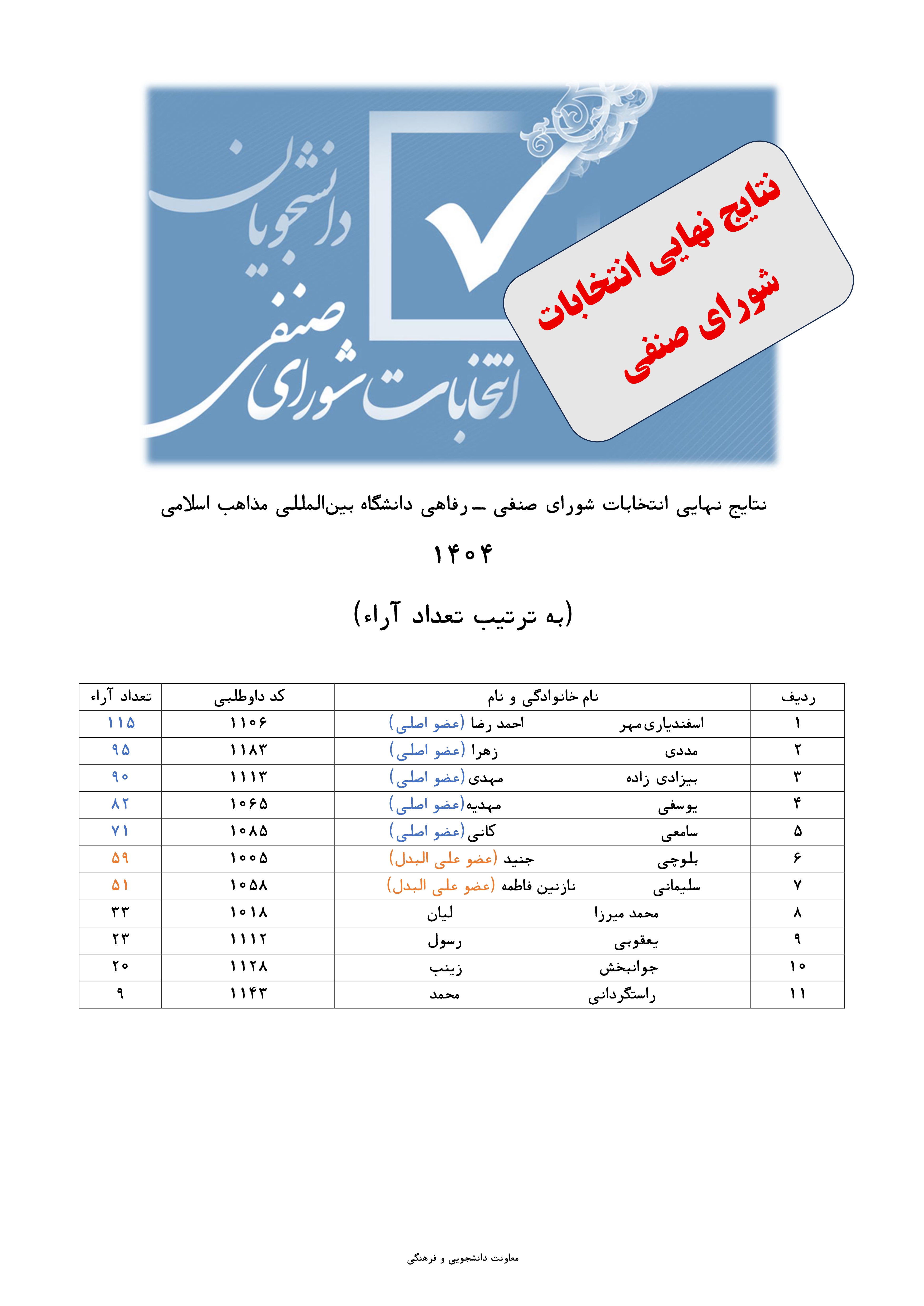 نتایج نهایی انتخابات شورای صنفی ـ رفاهی دانشگاه بین‌المللی مذاهب اسلامی 1404